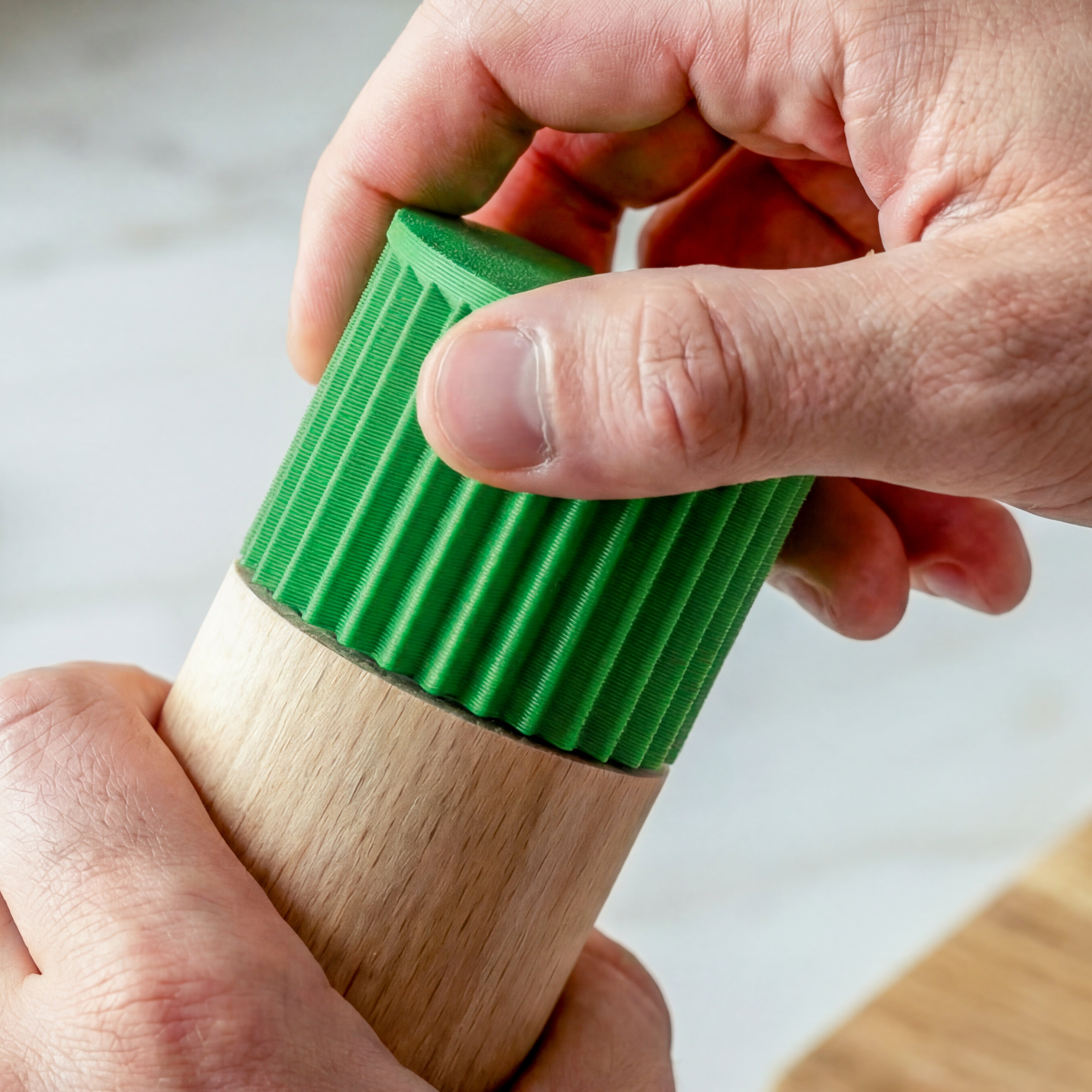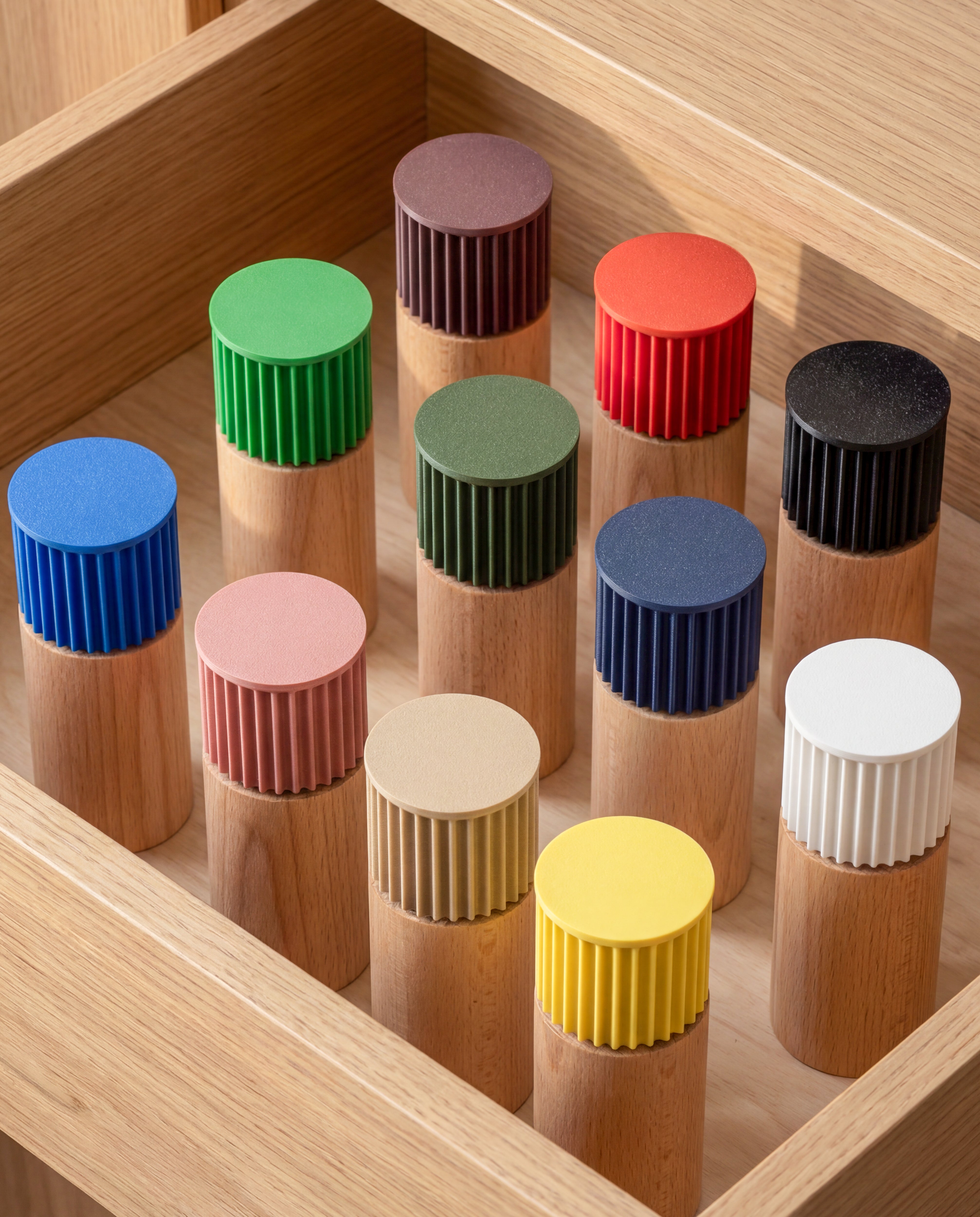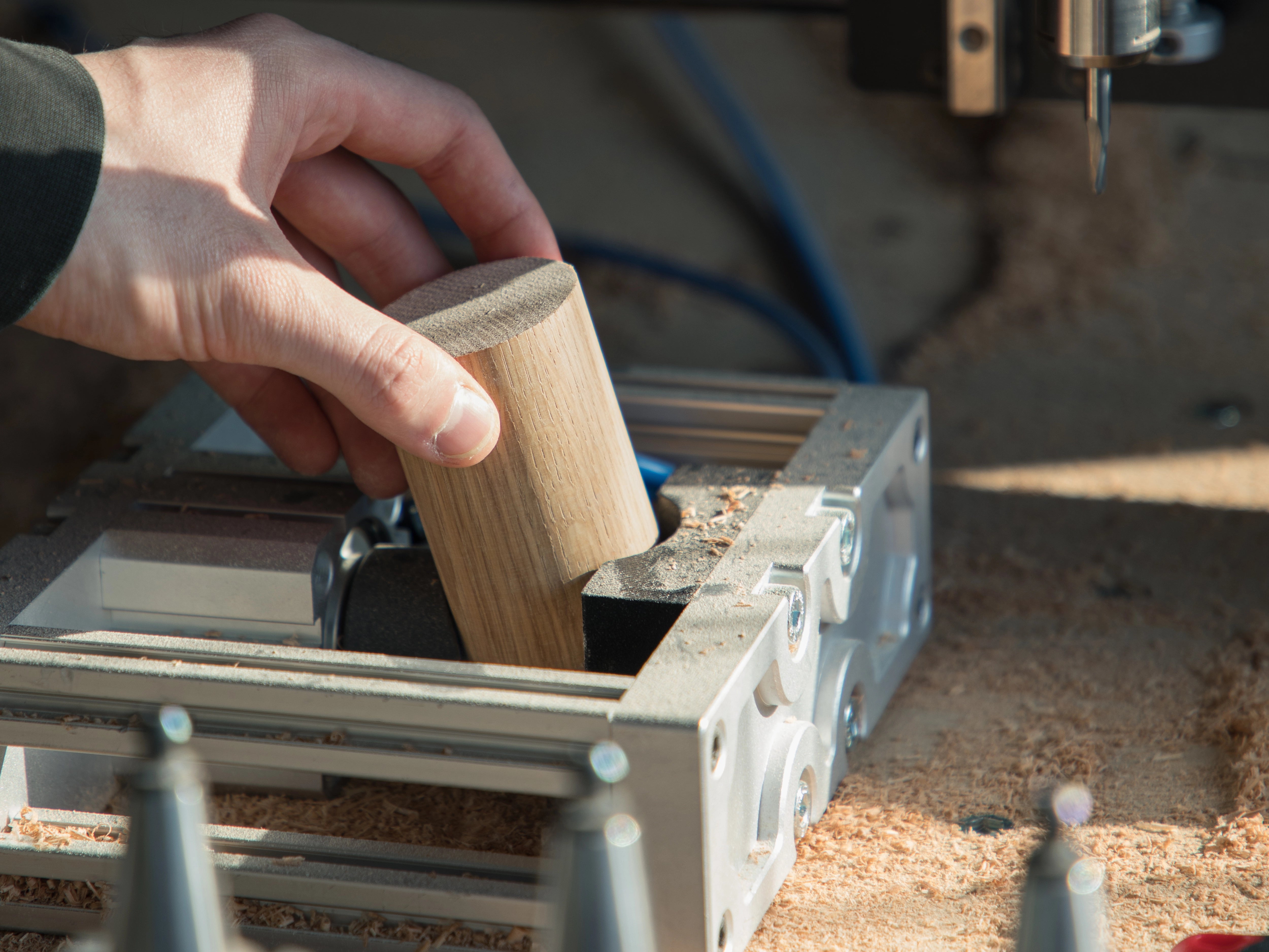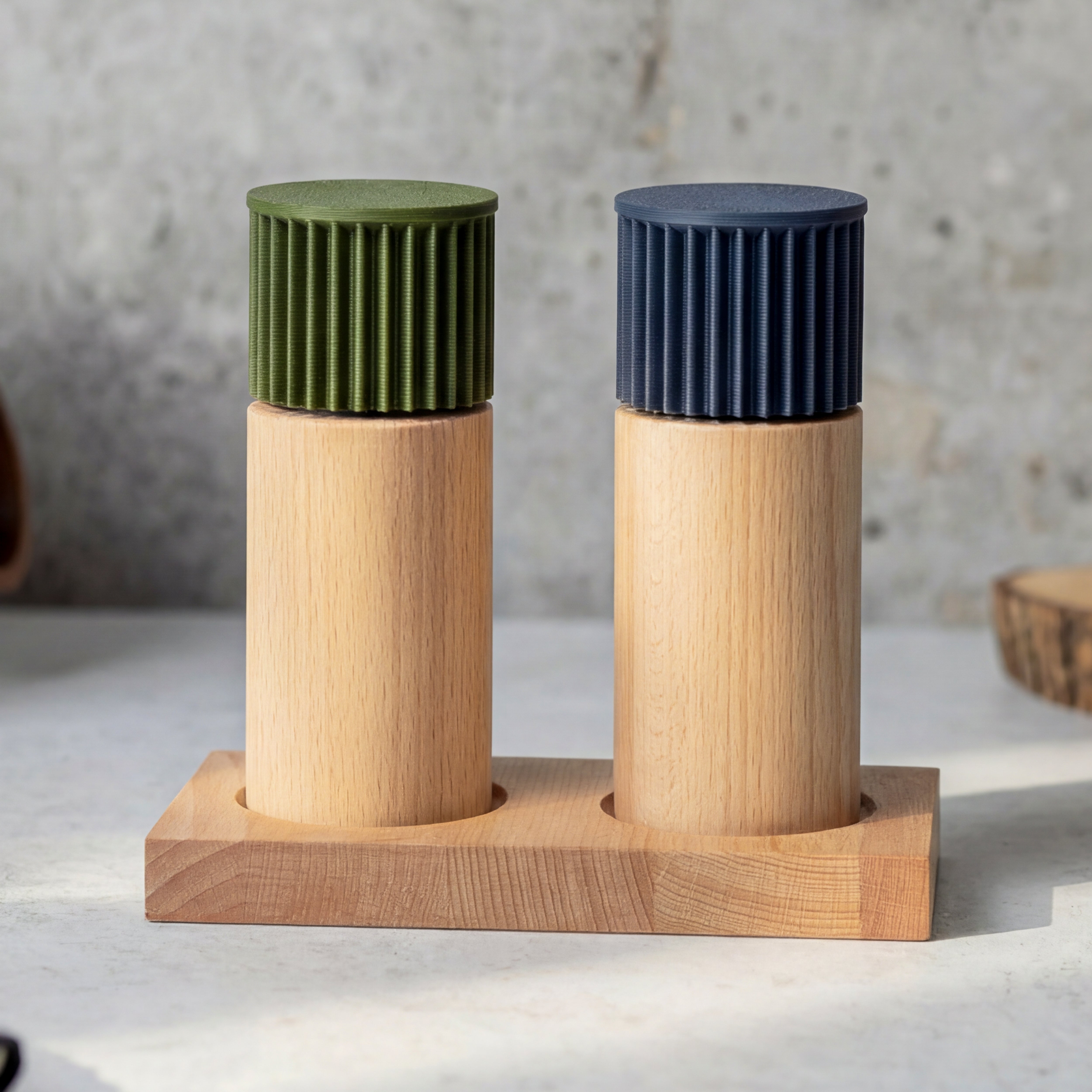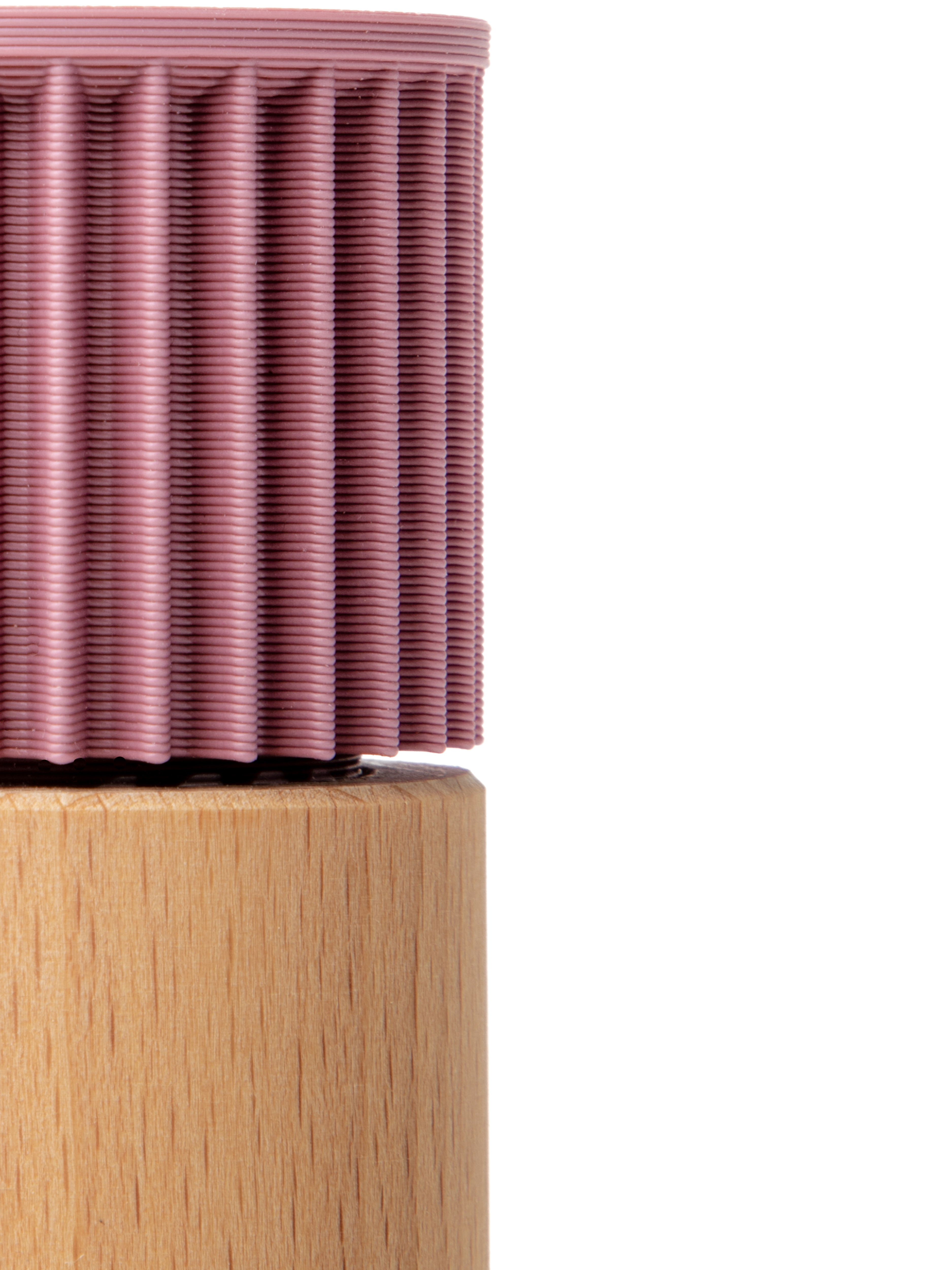 Der Unterteil aus massivem Buchenholz bringt Gewicht, Standfestigkeit und eine warme Haptik.