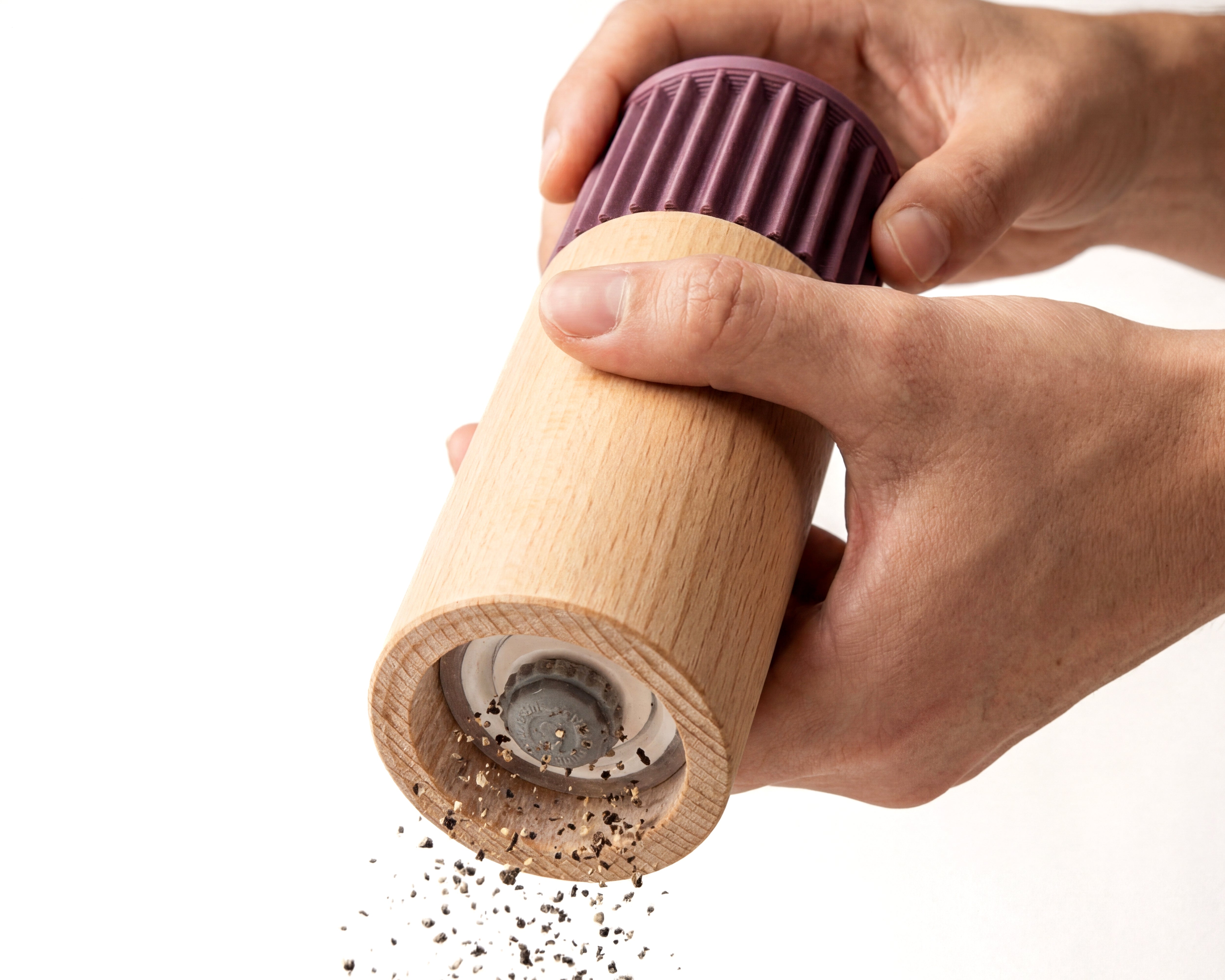 europäischem Buchenholz. Im Inneren arbeitet ein hochwertiges Keramikmahlwerk mit